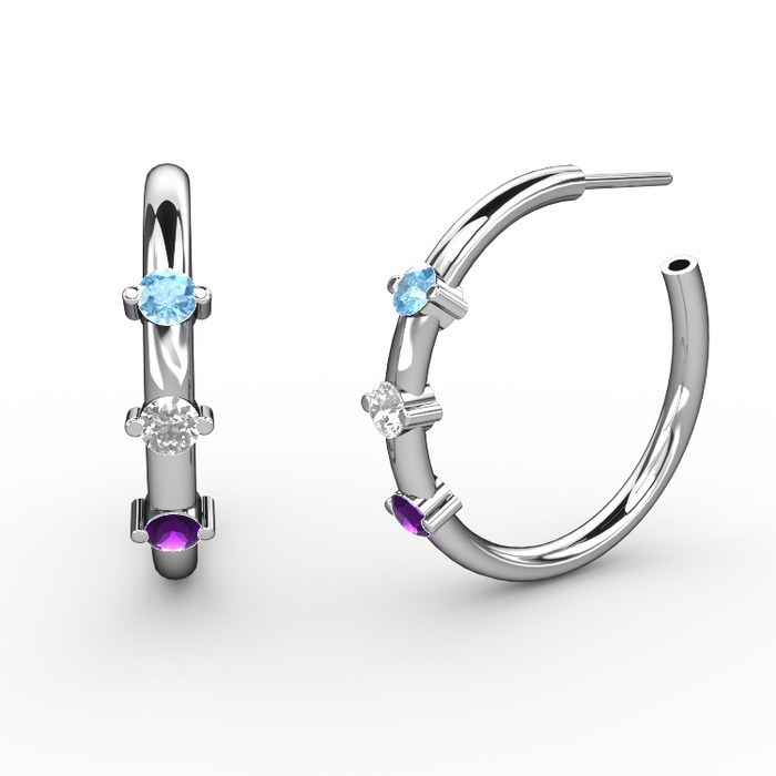 Ametist, beyaz zirkon ve akuamarin 18 ayar beyaz altın küpe