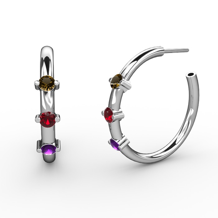 Ametist, garnet ve dumanlı kuvars 14 ayar beyaz altın küpe