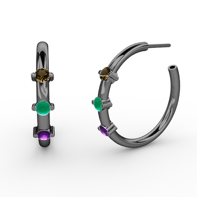 Ametist, kök zümrüt ve dumanlı kuvars 925 ayar siyah rodyum kaplama gümüş küpe