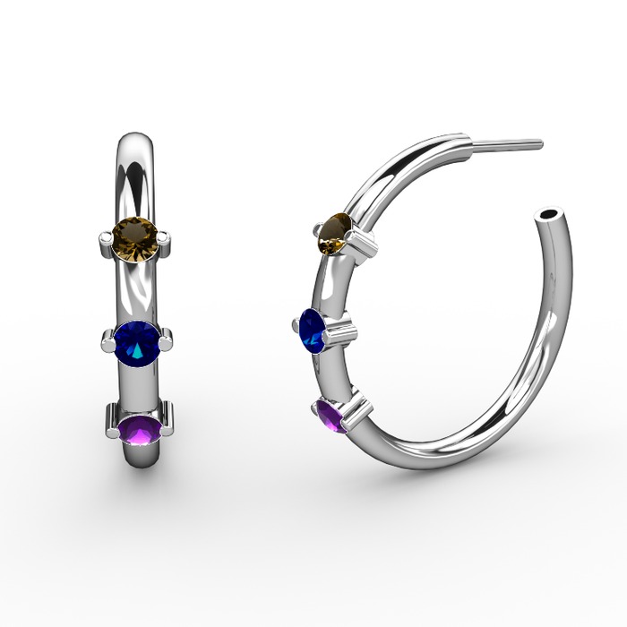 Ametist, lab safir ve dumanlı kuvars 8 ayar beyaz altın küpe
