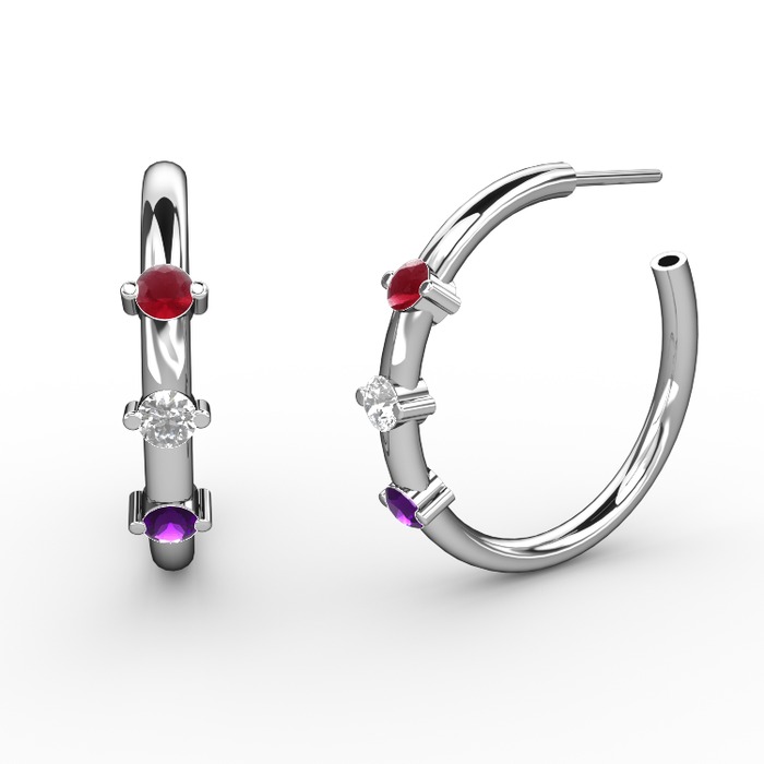 Ametist, pırlanta ve kök yakut 8 ayar beyaz altın küpe (0.22 karat)