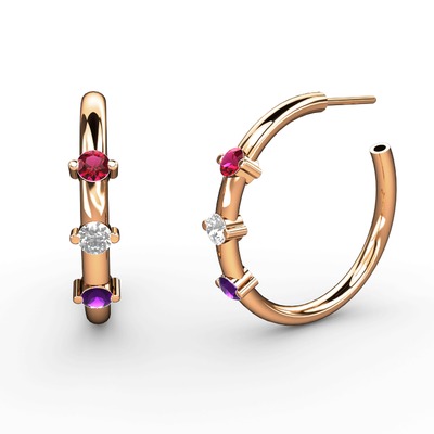 Ametist, pırlanta ve rodolit garnet 18 ayar rose altın küpe (0.22 karat)