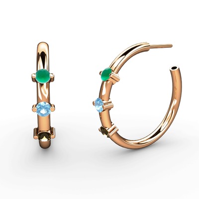 Dumanlı kuvars, akuamarin ve kök zümrüt 925 ayar rose altın kaplama gümüş küpe