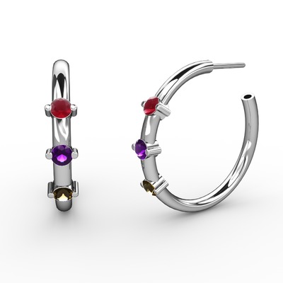 Dumanlı kuvars, ametist ve kök yakut 8 ayar beyaz altın küpe