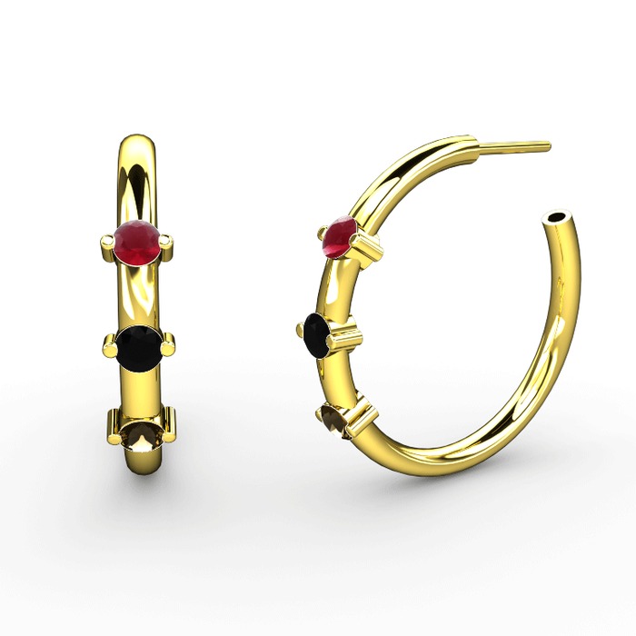 Dumanlı kuvars, siyah zirkon ve kök yakut 18 ayar altın küpe