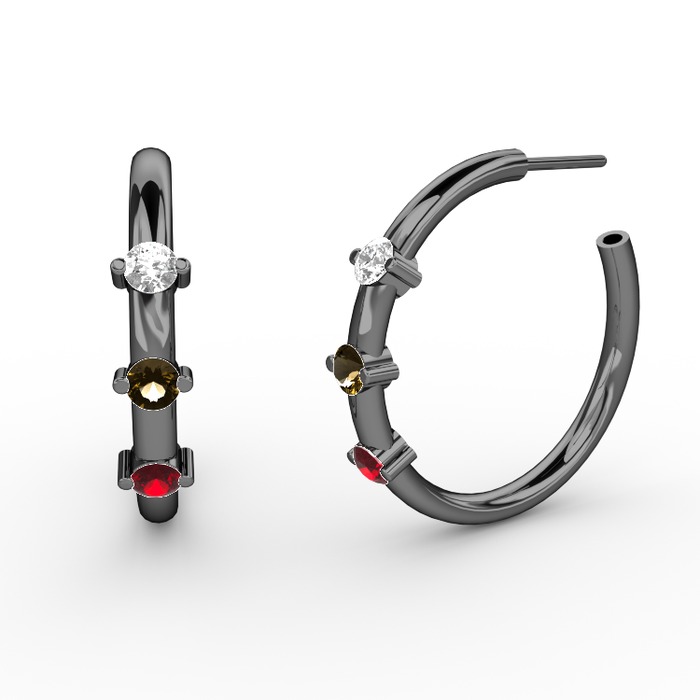 Garnet, dumanlı kuvars ve pırlanta 925 ayar siyah rodyum kaplama gümüş küpe (0.22 karat)