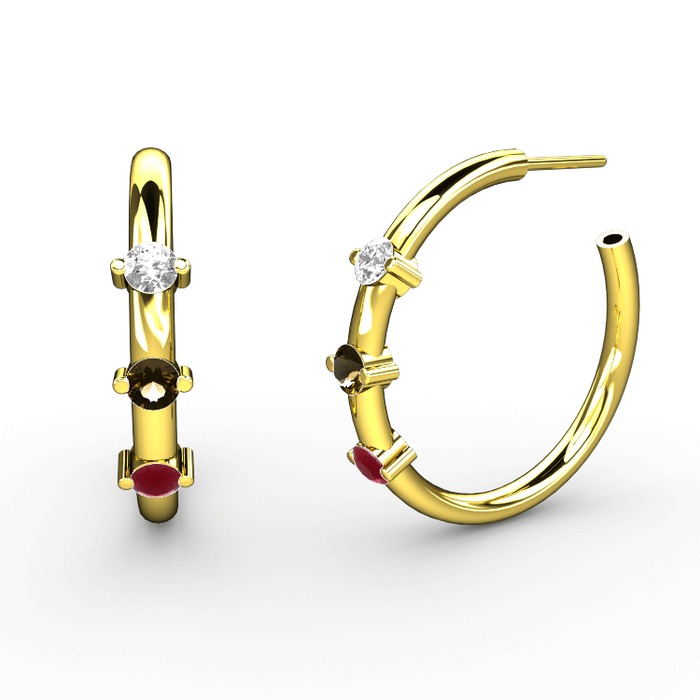 Kök yakut, dumanlı kuvars ve beyaz zirkon 8 ayar altın küpe