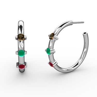 Kök yakut, kök zümrüt ve dumanlı kuvars 18 ayar beyaz altın küpe