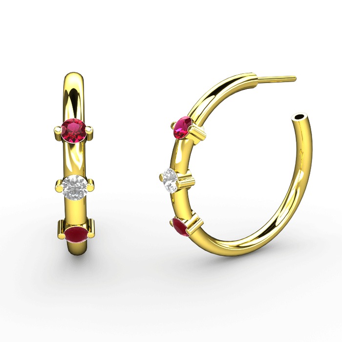 Kök yakut, pırlanta ve rodolit garnet 925 ayar altın kaplama gümüş küpe (0.22 karat)