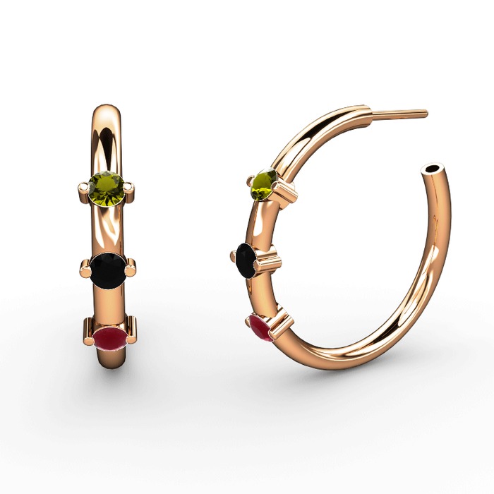 Kök yakut, siyah zirkon ve peridot 14 ayar rose altın küpe