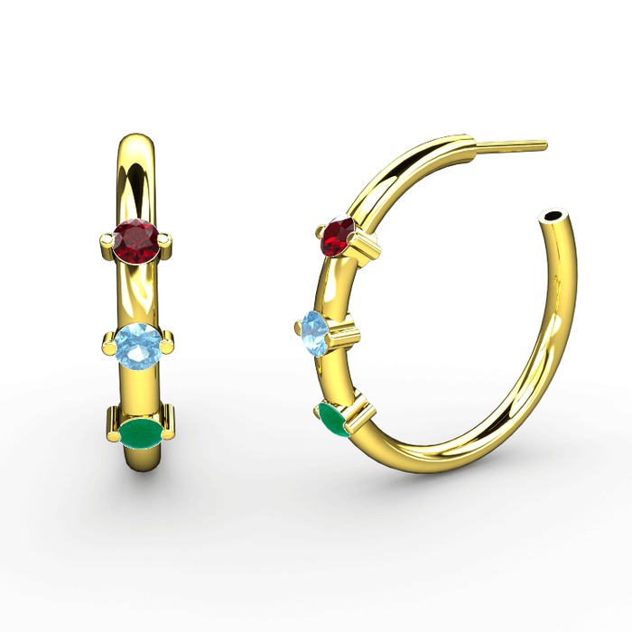 Kök zümrüt, akuamarin ve garnet 8 ayar altın küpe