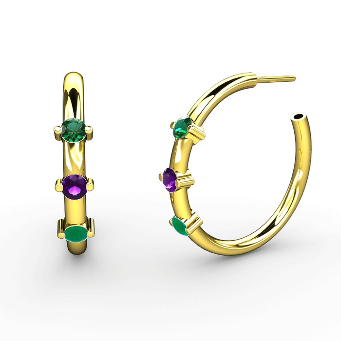 Kök zümrüt, ametist ve yeşil kuvars 8 ayar altın küpe