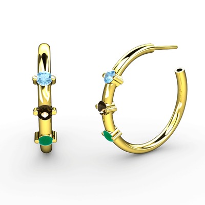 Kök zümrüt, dumanlı kuvars ve akuamarin 925 ayar altın kaplama gümüş küpe