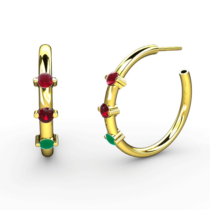 Kök zümrüt, garnet ve kök yakut 8 ayar altın küpe