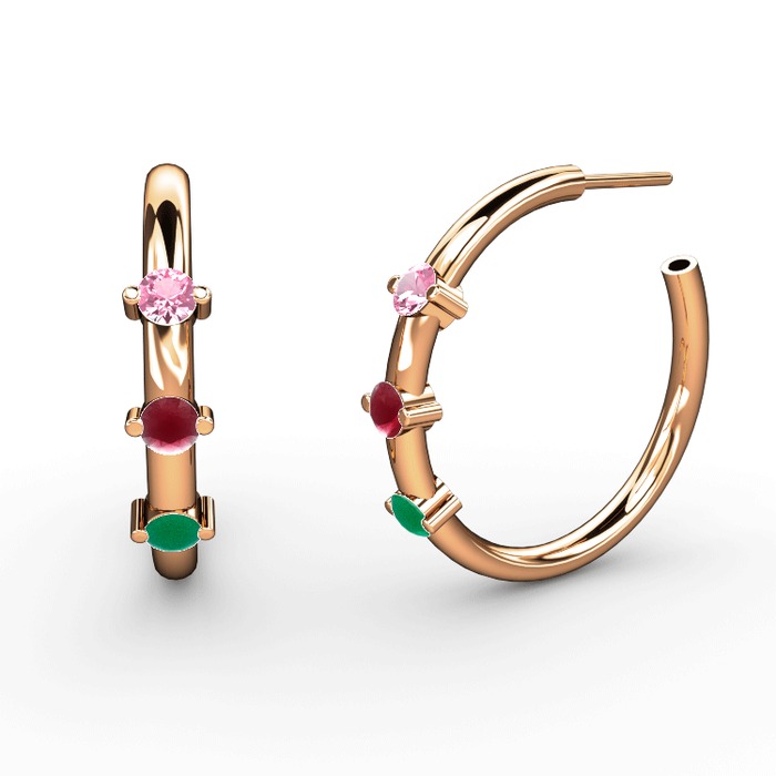 Kök zümrüt, kök yakut ve pembe kuvars 18 ayar rose altın küpe