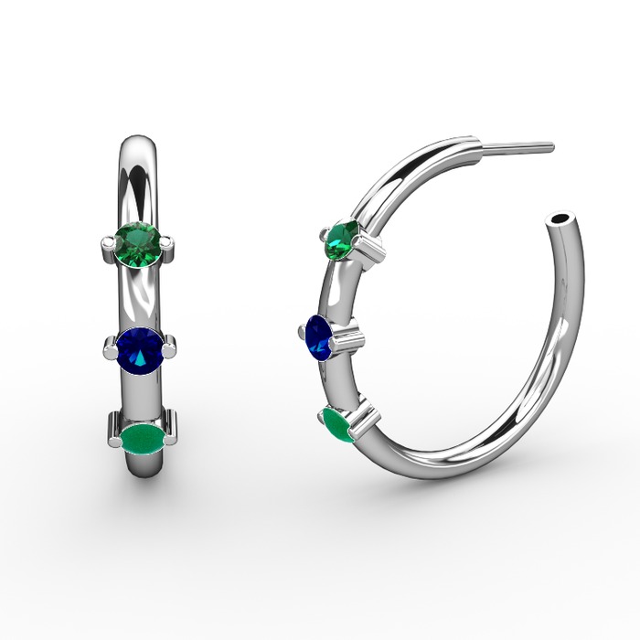 Kök zümrüt, lab safir ve yeşil kuvars 8 ayar beyaz altın küpe
