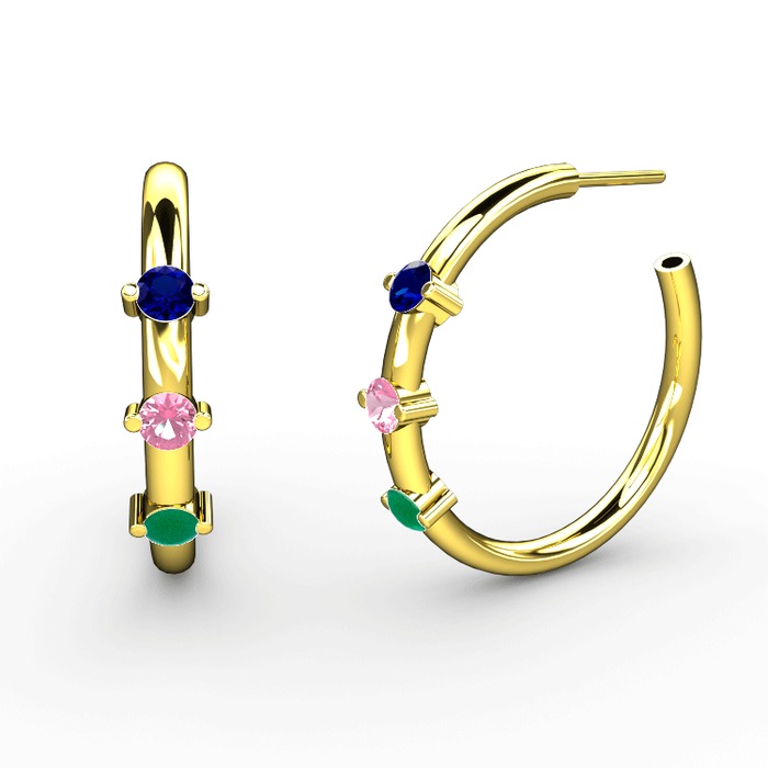 Kök zümrüt, pembe kuvars ve lab safir 8 ayar altın küpe
