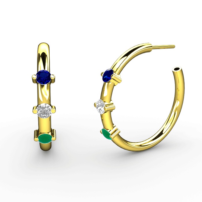 Kök zümrüt, pırlanta ve lab safir 18 ayar altın küpe (0.22 karat)