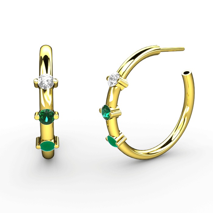 Kök zümrüt, yeşil kuvars ve beyaz zirkon 8 ayar altın küpe