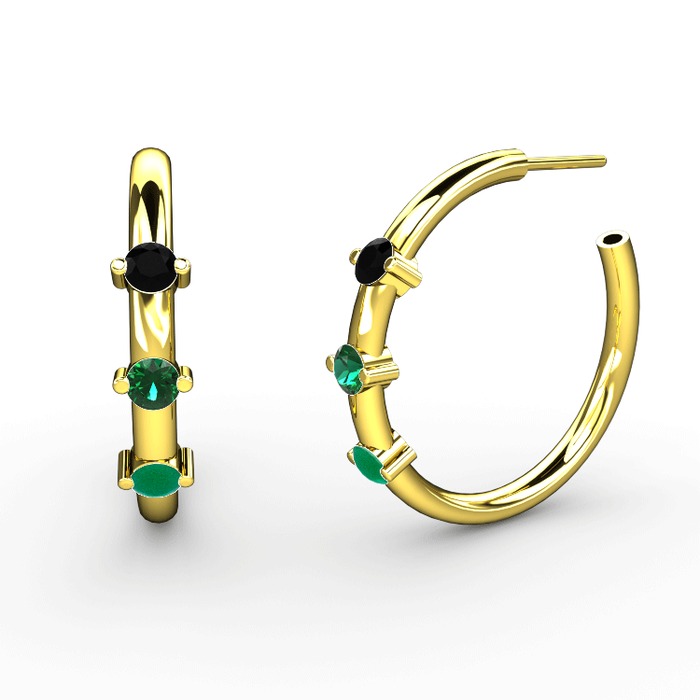 Kök zümrüt, yeşil kuvars ve siyah zirkon 18 ayar altın küpe