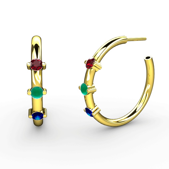 Lab safir, kök zümrüt ve garnet 8 ayar altın küpe