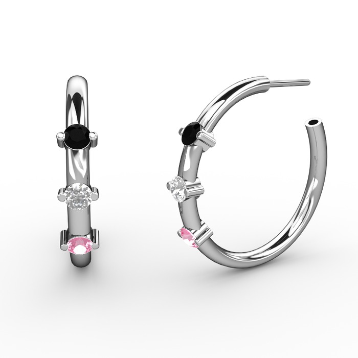 Pembe kuvars, beyaz zirkon ve siyah zirkon 14 ayar beyaz altın küpe