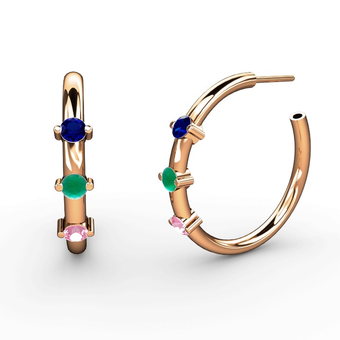 Pembe kuvars, kök zümrüt ve lab safir 8 ayar rose altın küpe