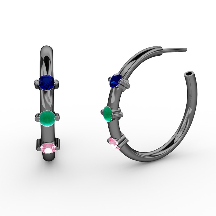 Pembe kuvars, kök zümrüt ve lab safir 925 ayar siyah rodyum kaplama gümüş küpe