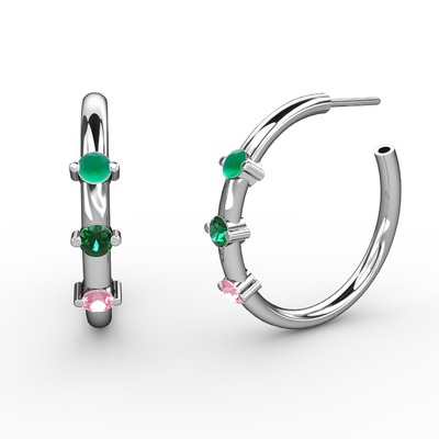 Pembe kuvars, yeşil kuvars ve kök zümrüt 14 ayar beyaz altın küpe