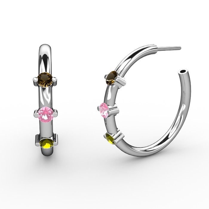 Peridot, pembe kuvars ve dumanlı kuvars 8 ayar beyaz altın küpe