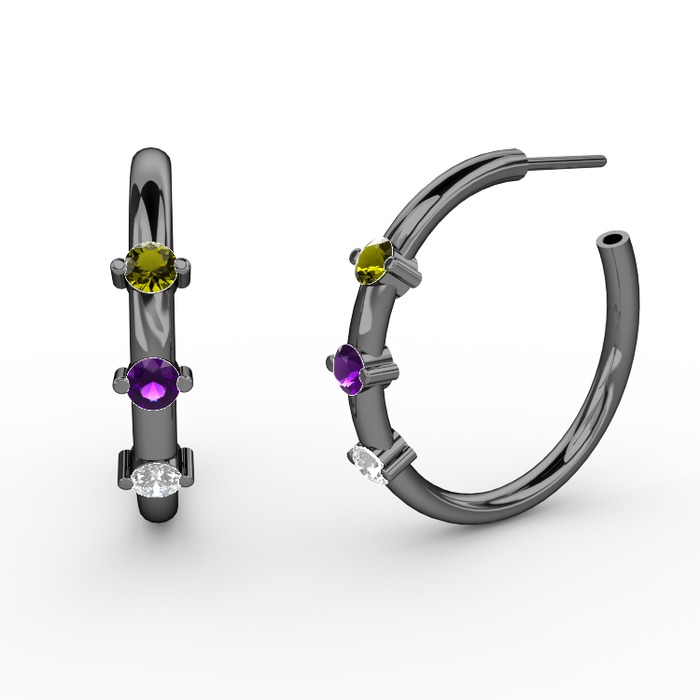 Pırlanta, ametist ve peridot 925 ayar siyah rodyum kaplama gümüş küpe (0.22 karat)