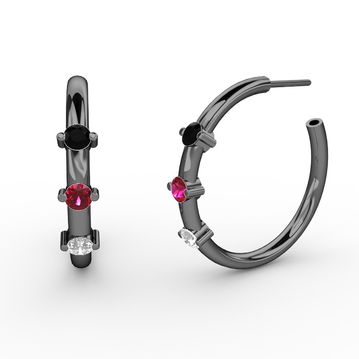 Pırlanta, rodolit garnet ve siyah zirkon 925 ayar siyah rodyum kaplama gümüş küpe (0.22 karat)