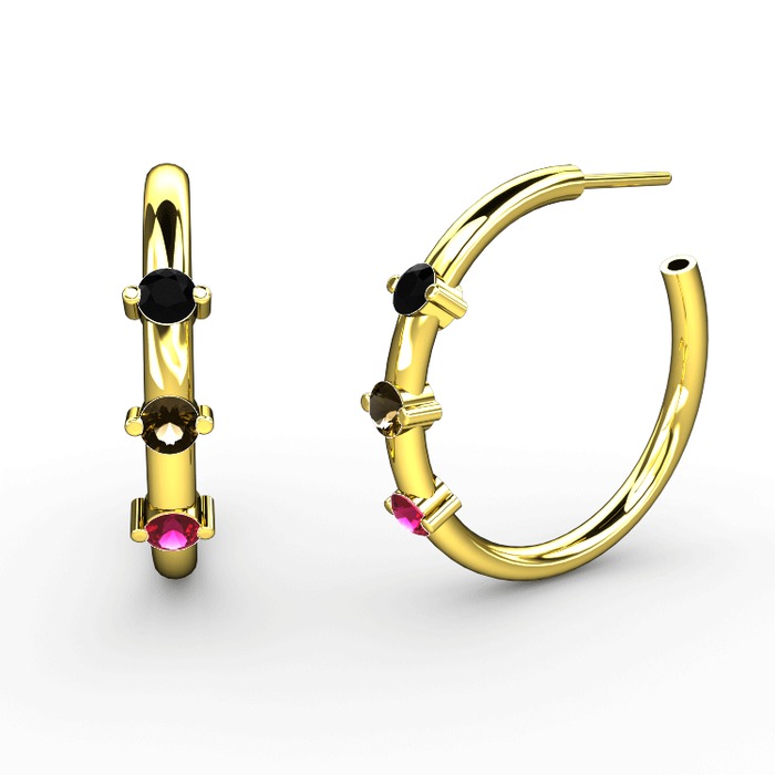 Rodolit garnet, dumanlı kuvars ve siyah zirkon 8 ayar altın küpe