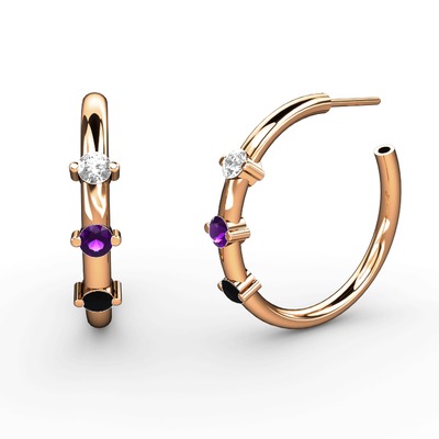 Siyah zirkon, ametist ve beyaz zirkon 8 ayar rose altın küpe