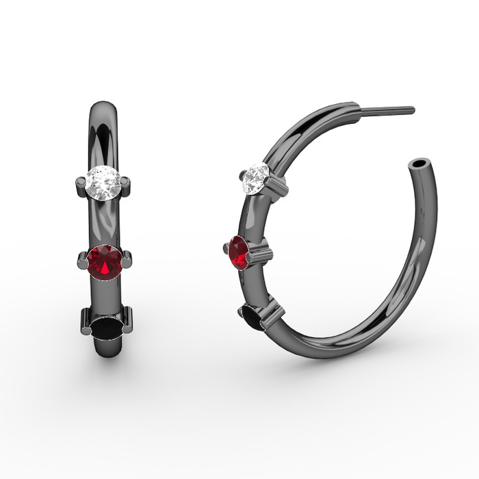 Siyah zirkon, garnet ve pırlanta 925 ayar siyah rodyum kaplama gümüş küpe (0.22 karat)