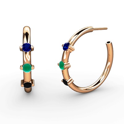 Siyah zirkon, kök zümrüt ve lab safir 8 ayar rose altın küpe
