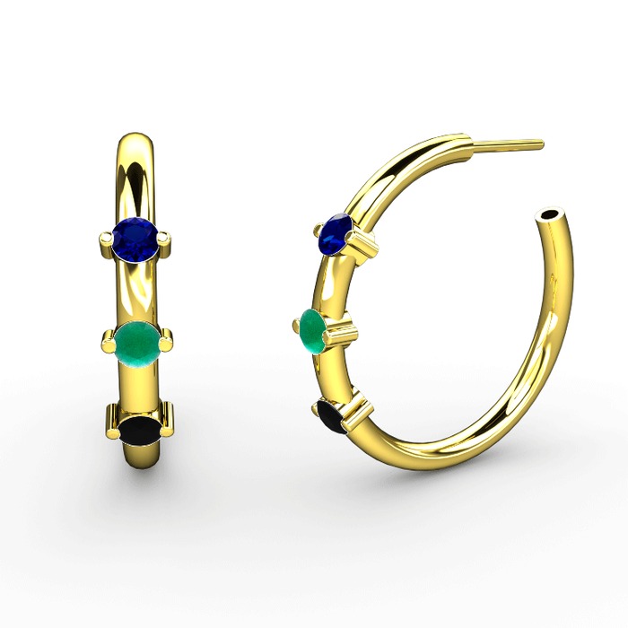 Siyah zirkon, kök zümrüt ve lab safir 925 ayar altın kaplama gümüş küpe