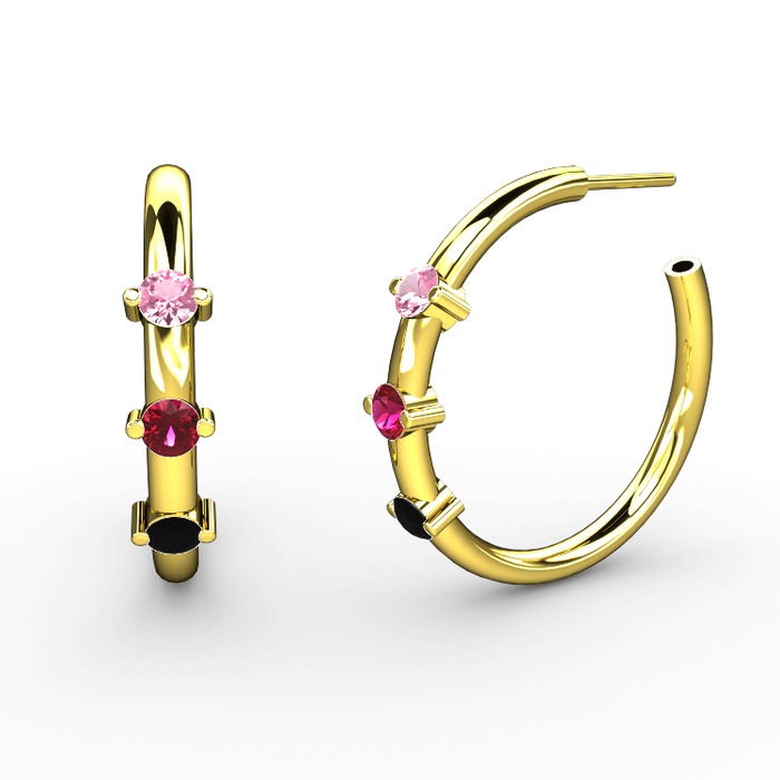Siyah zirkon, rodolit garnet ve pembe kuvars 14 ayar altın küpe