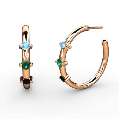 Siyah zirkon, yeşil kuvars ve akuamarin 14 ayar rose altın küpe