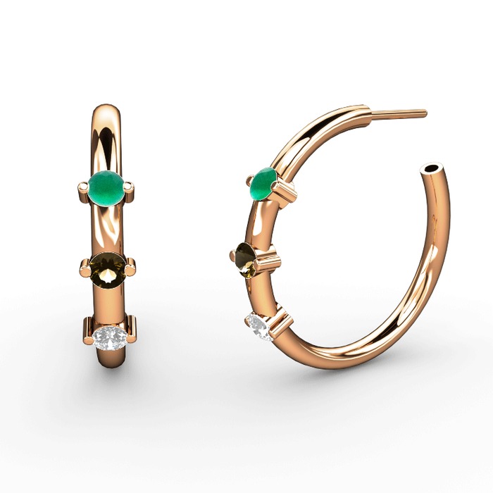 Swarovski, dumanlı kuvars ve kök zümrüt 8 ayar rose altın küpe