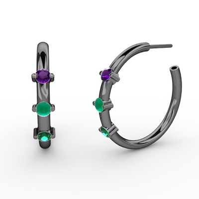 Yeşil kuvars, kök zümrüt ve ametist 925 ayar siyah rodyum kaplama gümüş küpe