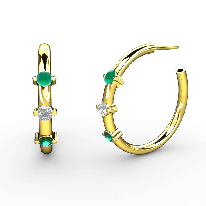 Yeşil kuvars, swarovski ve kök zümrüt 14 ayar altın küpe