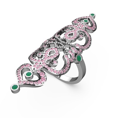 Pembe kuvars ve kök zümrüt 18 ayar beyaz altın yüzük