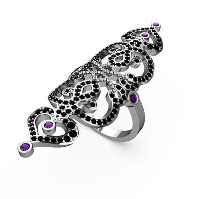 Siyah zirkon ve ametist 14 ayar beyaz altın yüzük