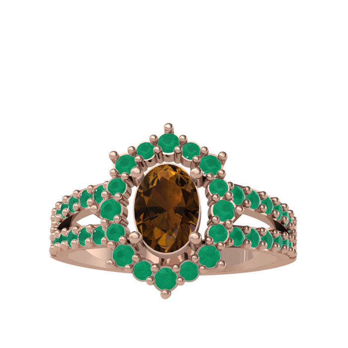 Dumanlı kuvars ve kök zümrüt 925 ayar rose altın kaplama gümüş yüzük