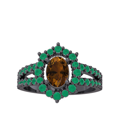 Dumanlı kuvars ve kök zümrüt 925 ayar siyah rodyum kaplama gümüş yüzük