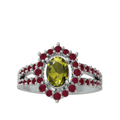 Peridot ve kök yakut 8 ayar beyaz altın yüzük
