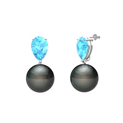 Siyah inci ve akuamarin 14 ayar beyaz altın küpe