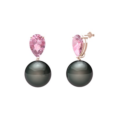 Siyah inci ve pembe kuvars 18 ayar rose altın küpe
