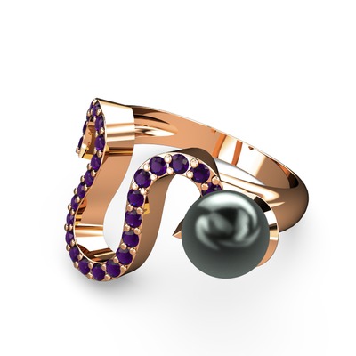 Siyah inci ve ametist 925 ayar rose altın kaplama gümüş yüzük